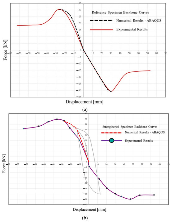 The force–displacement graphs of the reference and strengthened test specimens obtained from experimental and numerical analyses are shown in Figure 21. To enable a more accurate comparison of experimental and numerical study results, the comparison was performed using backbone curves obtained from hysteresis curves. The backbone curves obtained from the cyclic loading test results for the reference and strengthened specimens were overlaid with the backbone curves obtained from the numerical analysis results, and the results of both studies were compared for both specimens.