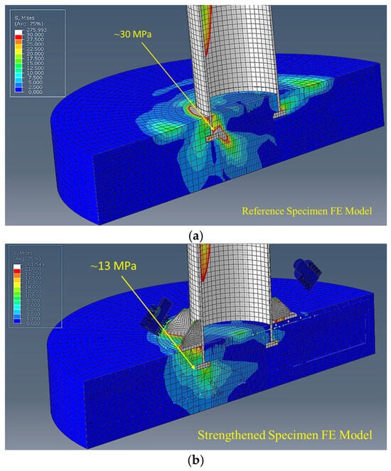 Finite element analysis results. (a) Reference model and (b) strengthened model (unit, MPa).