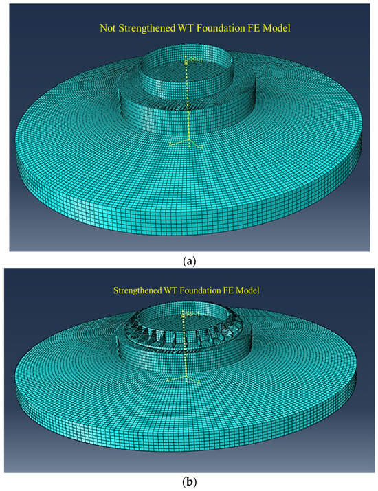 Wind turbine foundation finite element model. (a) Existing (not strengthened) model and (b) strengthened model.