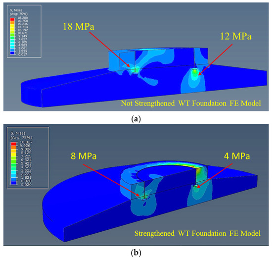 As a result of the finite element studies, it was determined that the strengthening method developed for wind turbines with an embedded ring tower–foundation connection type reduced the stresses in the foundation by 67%.