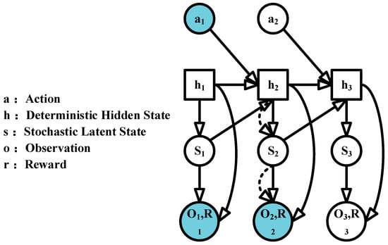 The Recurrent State Space Model (RSSM) offers an elegant and powerful framework for probabilistic state representation and the uncertainty modeling of complex dynamic systems, which are particularly crucial in inherently stochastic environments like traffic. The core architecture of the RSSM is schematically depicted in Figure 3, adapted from the work presented in [27]. Its core idea is to abstract the true state of a system into unobservable latent variables, assuming that system dynamics and observation generation are driven by these latent variables. The RSSM typically comprises three key components: a state transition model that probabilistically describes the evolution of latent variable states over time, capturing dynamic system uncertainties; an observation model that defines how observable outputs are generated from latent variable states; and an initial state distribution that describes the latent variable states at the initial time. By incorporating recurrent connection mechanisms, the RSSM effectively processes temporal input data, leveraging historical information for a more accurate inference and prediction of current states, thereby adapting to complex and continuous dynamic environments. The application of deep neural networks [28] further parameterizes the RSSM, enabling it to learn effective latent variable representations from high-dimensional sensory data and make precise future state predictions. Google DeepMind’s Dreamer series models (e.g., DreamerV2 [29], DreamerV3 [30]) notably utilize the RSSM as their core technical foundation, achieving an exceptional performance across various complex tasks and fully demonstrating the RSSM’s central role in constructing World Models with predictive and uncertainty-handling capabilities.