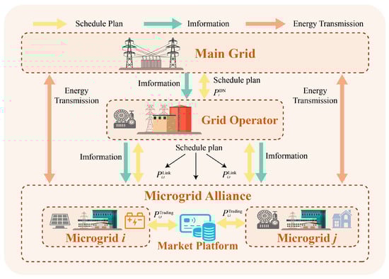 The multi-microgrid system comprises a grid operator, a microgrid alliance, and individual microgrids, as depicted in Figure 1. The grid operator acting as the upper-level authority oversees power supply adjustments and manages energy and carbon quota interactions. The microgrid alliance serves as an intermediary, facilitating coordination between the grid operator and individual microgrids. Based on its own energy needs and carbon targets, a microgrid can trade energy and carbon quotas with the grid operator or other microgrids, enhancing overall system performance.