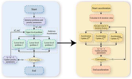 The right section illustrates the integration of Anderson acceleration, which enhances the convergence of the iterative process. It leverages the iteration history to adjust key variables more effectively, avoiding oscillation and reducing the number of iterations required. During each acceleration step, adjustments are made to the main coordination parameters based on past iteration data, and the penalty parameters are updated adaptively until convergence is achieved.