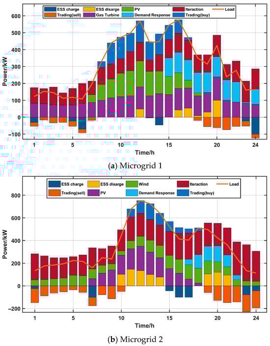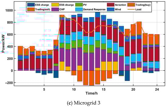 Figure 3 shows power distribution among microgrids after implementation. Microgrids 1 and 2, equipped with higher shares of photovoltaic and wind power generation, export excess electricity to Microgrid 3 during periods of low load or renewable generation peaks. In contrast, during high-demand periods, Microgrid 3 utilizes its gas turbine units to supply electricity to the other two microgrids. The power exchange is dynamic and varies with time, reflecting the fluctuations in renewable output and demand levels. During off-peak hours, Microgrid 3 reduces its own generation and purchases more low-carbon electricity from Microgrids 1 and 2 to optimize operational costs and improve efficiency.