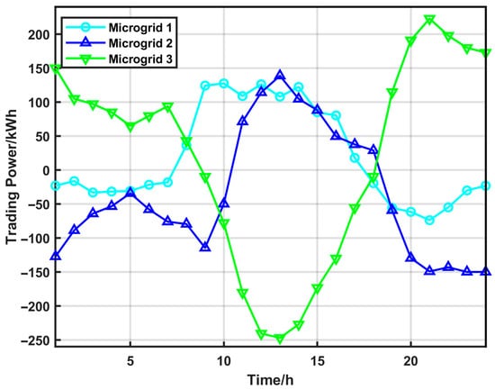 Figure 7 shows the iterative process of linking power between the microgrids and the grid operator under two scenarios. In the case without inter-microgrid trading, the linking power values gradually stabilize and converge within seven iterations. When inter-microgrid trading is enabled, the presence of additional coupling relationships leads to a slightly longer convergence process, reaching stability after nine iterations. In both cases, the linking power values from different microgrids align to a common value as the iterations progress.