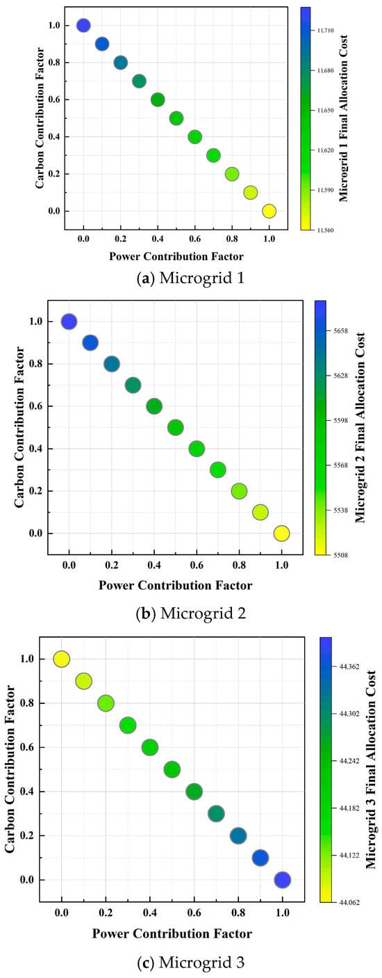 Figure 5 illustrates the impact of different power and carbon contribution weightings on revenue allocation among microgrids. When carbon weighting increases, Microgrids 1 and 2 receive higher revenues due to their greater renewable generation. Conversely, higher power weighting shifts more revenue to Microgrid 3, which has a larger generation capacity. The allocation pattern changes gradually with the weighting, showing a clear trade-off between power and carbon contributions.