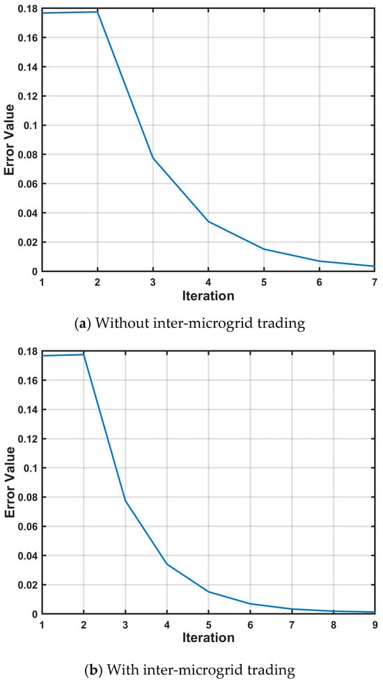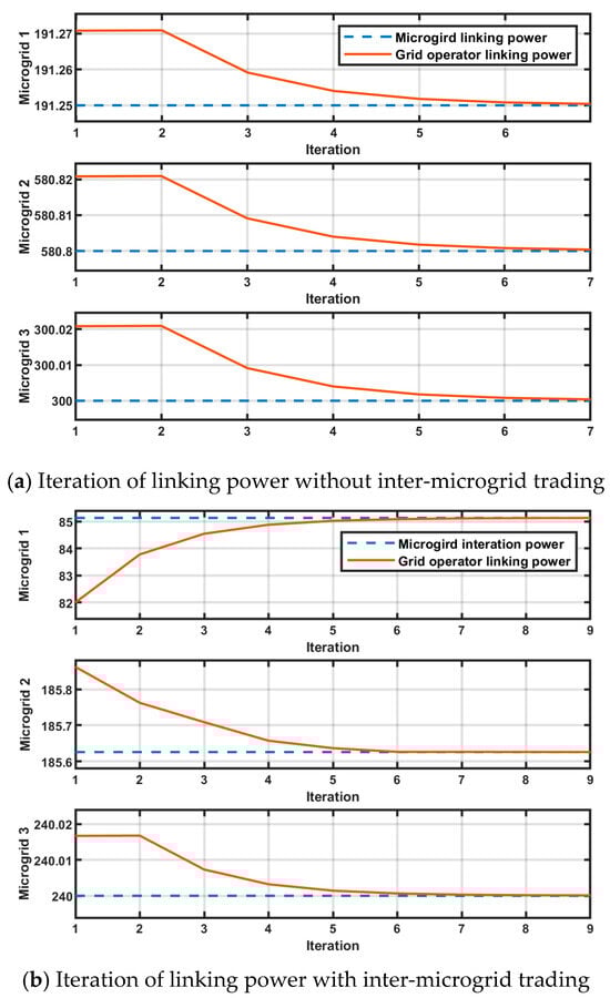 Iteration of linking power: (a) without inter-microgrid trading; (b) with inter-microgrid trading.
