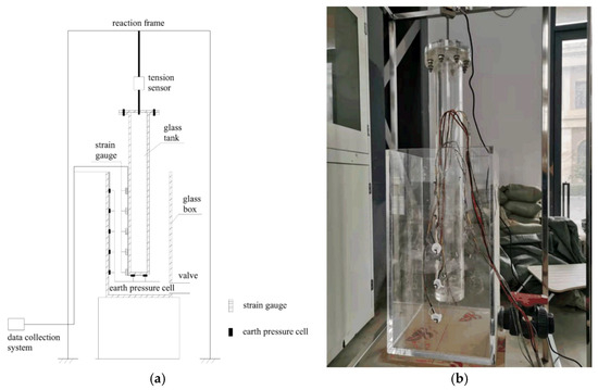 The buoyancy test utilises a self-design simple buoyancy model device (manufactured by Zhifang Hardware Machinery Factory, Hangzhou, China), comprising four principal subsystems. The core component is an 800 mm tall organic glass cylinder (100 mm diameter, 10 mm wall thickness) secured with eight bolts through its upper flange, which integrates dual water injection ports and maintains a 100 mm base clearance. This is housed within a 600 mm high plexiglass test tank (300 × 300 mm base, 12 mm wall thickness) featuring a slurry inlet 50 mm above its baseplate and matching bottom clearance. The sensing system includes the following: a 100 N tension load cell (Nanjing Danmo Electronics Co., Ltd., Nanjing, China) suspended from the reaction frame; paired earth pressure cells symmetrically installed at the cylinder base and tank sidewall; and a data acquisition unit (Weihan Instruments, Puyang, China). This configuration enables simultaneous measurement of vertical buoyancy forces through direct tension sensing and distributed fluid pressures via the dual earth pressure transducers, with the bottom clearances facilitating analysis of pressure distribution dynamics. The integrated system, as illustrated in Figure 2, allows comparative evaluation of buoyancy generation mechanisms through synchronised force-pressure data correlation.
