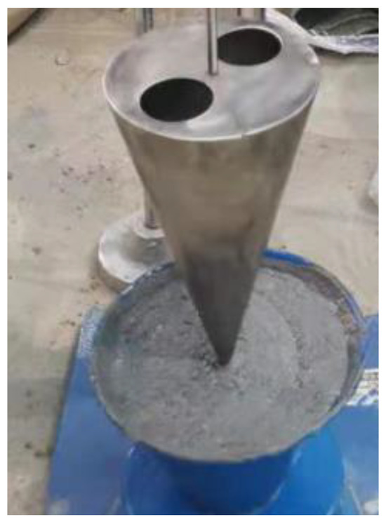 Flow index determination employed a custom-designed penetration cone (570 g total mass) (Figure 3). Featuring a 200 mm height with 53.59 mm base radius and 30° tapered tip, the cone incorporated a top-mounted counterweight chamber for precision mass adjustment. The experimental procedure is in agreement with the requirements of the consistency test. By adding sand into the hole to change the balance weight of the cone, the sinking depth under varying balance weight was measured, and the theoretical buoyancy and gravity of the cone under each balance weight were calculated. The percentage of the ratio of the two is the flow index. The flow index is expressed as follows: