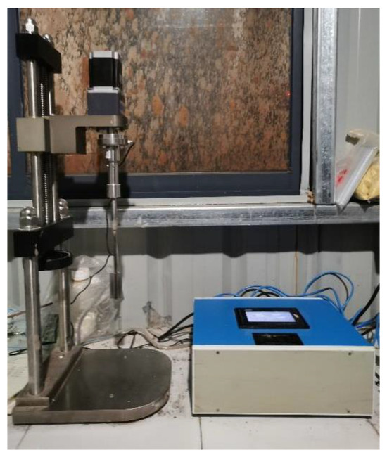 The shear strength testing employed a TT-LVS automatic cross plate shear tester (Suzhou Tuotest Instrument Equipment Co., Ltd., Suzhou, China, Figure 4), designed for measurement of soft/sensitive clay shear strength and undrained grout shear strength. The system configuration comprised a Φ100 × 177 mm sample chamber paired with a Φ25.4 × 50.8 mm cross plate, operating at 0.001–180°/min strain rates through stepless speed regulation. Torque sensor utilised a 0~30 N·m range with ±0.3% FS accuracy and 0.1 N·m resolution.