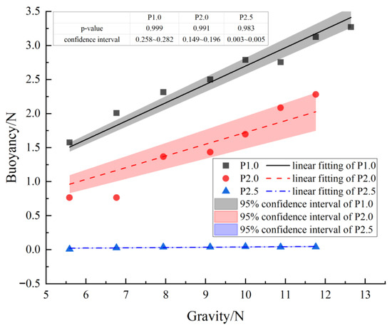 As illustrated in Figure 5, the linear regression analysis of flow indices for grout groups P1.0, P2.0, and P2.5 demonstrates a statistically significant linear correlation (R2 > 0.95) between buoyance and gravity. The coefficients of determination values were 0.99753, 0.98700, and 0.97410, respectively, exceeding the 0.95 threshold for strong linear predictability. The p-values of P1.0, P2.0, and P2.5 are 0.999, 0.991, and 0.983. The confidence intervals of P1.0, P2.0, and P2.5 are [0.258~0.282], [0.149~0.196], and [0.003~0.005]. While the flow index methodology originates from the consistency test method, it exhibits superior measurement stability with reduced experimental variance (σ < 5%) compared to standard consistency tests, effectively mitigating the measurement uncertainty characteristic of traditional approaches.
