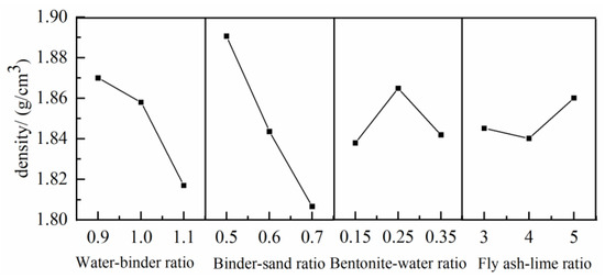 An orthogonal test with four factors (water–binder ratio, binder–sand ratio, bentonite–water ratio, fly ash–lime ratio), each evaluated at three levels, was conducted. The L9(34) orthogonal array detailing factor-level combinations is tabulated in Table 3.