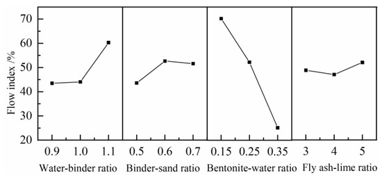 Figure 7 presents the parametric relationship slurry ratio and flow index, showing a broad variation range of 20–70%. The bentonite–water ratio exerts dominant control, with flow index decreasing approximately linear as this ratio increase, whereas binder-sand and fly ash-lime ratios demonstrate negligible influence. Owing to the spatial network structure of bentonite, bentonite has the property of water absorption and swelling and can absorb a large amount of free water in the slurry, which reduces the free water content in the slurry and increases the bound water content and leads to the decline of the slurry flow index. In addition, the flow index shows an overall upward trend with an increase in the water–binder ratio. The increase in the water–binder ratio increases the overall slurry porosity, decreases the contact area between particles, and weakens the occlusal effect; as a result, the flow index also increases. Therefore, increasing the amount of bentonite can effectively weaken the fluidity of the slurry.