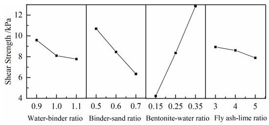 Some researchers discussed the influence of a certain component on grout. Kim et al. [30] and Yang et al. [16] proposed that fly ash could fill slurry pores and improve slurry workability. Toniolo et al. [25] and Xu et al. [22] proposed that hydrated lime reacts with fly ash to produce a gelatinous substance that can improve the strength of grout. Bezuijen et al. [31] and Delaleux et al. [26] found that bentonite can fill pore and make grouts more compact. Further research considering the type and mesh size of bentonite has found that sodium bentonite makes grouts have better water retaining property than calcium bentonite [31,32]. In addition, some researchers have studied sand and sandy soil and found that the content of coarse and fine particles, and particle size, have a significant correlation with the shear strength [33]. Few studies have examined the influence of the grout component ratio on the shear strength and fluidity index, and no quantitative study has been conducted.