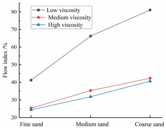 Figure 9 illustrates the relationship between flow index and sand type/bentonite characteristics, demonstrating a significant positive correlation between flow index and sand particle size. Slurries incorporating low-viscosity bentonite exhibit 25–30% higher flow indices than medium-viscosity or high-viscosity bentonite formulations. The accelerated growth rate of flow index with coarser sand gradation confirms dual control by sand granulometry and bentonite viscosity grade. Notably, flow indices of clay-based bentonite slurries show negligible variation across mesh number gradients (1250 vs. 325 mesh), indicating limited sensitivity to bentonite particle size distribution.