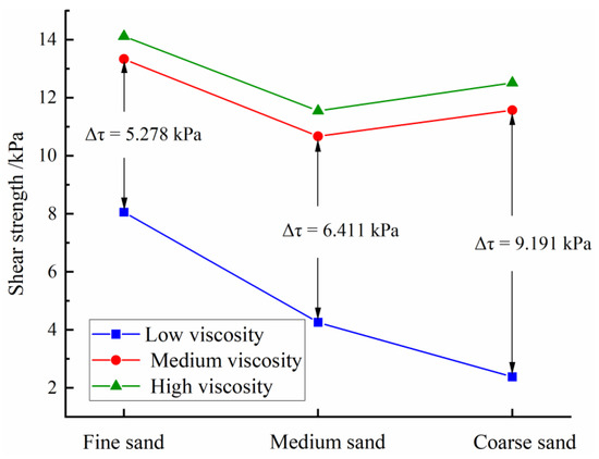 As for the slurry mixed with medium-viscosity bentonite and high-viscosity bentonite, the slurry is thicker, and its state exhibits both liquid and solid properties. In case of fine sand, as a result of fine particles better filling the slurry, the overall specific surface area of fine particles is larger. Consequently, the contact area between the solid particles is larger, and improved shear strength of the slurry results. The shear strength improvement is more powerful than the bite force of coarse sand; the mixing of medium-viscosity bentonite with high-viscosity bentonite affords higher shear strength. As indicated by Figure 10, the shear strength of medium bentonite slurry mixed with fine sand is 5.278 kPa larger than that of low-viscosity bentonite slurry, and that of medium-viscosity bentonite slurry mixed with medium sand is 6.411 kPa larger than that of low-viscosity bentonite slurry. Meanwhile the shear strength of medium-viscosity bentonite slurry mixed with coarse sand is 9.191 kPa larger than that of low-viscosity bentonite slurry. The shear strength of the slurry with larger sand particle size increases more when the low-viscosity bentonite was replaced by medium-viscosity bentonite. This result indicates that the biting force between coarse particles begins to play a role at this time, making the shear strength associated with coarse sand higher than that with medium sand.