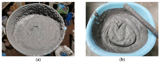 Appearance of coarse sand and fine sand in slurry mixed with low-viscosity: (a) grout mixed with low-viscosity bentonite and coarse sand; (b) grout mixed with low-viscosity bentonite and fine sand.
