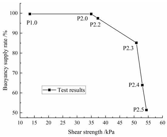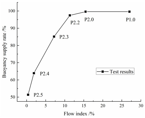 Figure 12 depicts the relationship between buoyancy supply rate and flow index. The buoyancy supply rate increases gradually with increasing flow index, and the growth rate decreases. When the flow index reaches 15.46% (P2.0), the slurry buoyancy supply rate is 99.63%. The measured buoyancy is close to the theoretical buoyancy, indicating that grout is a liquid. The bentonite content increases from P2.0 (6.5%) to P2.2 (7%), the buoyancy supply ratio exhibits a distinct initial decrease from 99.6% to 97.4%, concurrently with grout transitioning progressively from a liquid state to a fluid–plastic and then semi-solid state. When the flow index is 0.37% (P2.5), the slurry buoyancy supply rate is only 51.41%. It indicated that grout is in a semi-solid state.