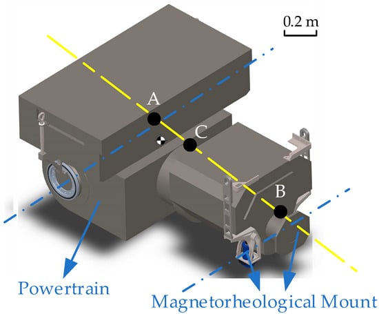 The structure of the powertrain is shown in Figure 1. Point C is the center of the mass of the powertrain, and the rear part, A, is connected to the chassis and the active wheel axle. Two vibration-damping devices are connected to the chassis and the front part, B, of the powertrain.