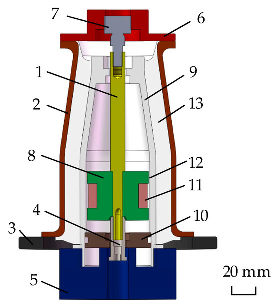 Schematic diagram of the structure of the MR mount. Piston—1; casing—2; reinforcing plate—3; piston rod—4; transition seat—5; upper cover—6; ball hinge—7; piston—8; inner sleeve—9; injection end cap—10; excitation coil—11; damping channel—12; rubber—13.