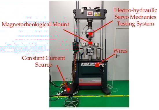 When the vertical static stiffness of each MR mount reaches 3 kN/mm, the rated static load of each damper is 9800 N, and the natural frequency is about 8.7 Hz. The controlled characteristics of the stiffness and damping of the MR mounts were tested using the dynamic mechanical performance testing system shown in Figure 3, as follows