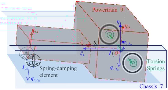 The interconnection between the powertrain and the chassis is illustrated in Figure 5. The powertrain is connected to the vehicle chassis by two MR mounts and two rubber mounts. These can be regarded as elastic damping hinges and column hinges, respectively. Assuming that the performances of the two mounts are identical and those of the two torsion springs are also identical, the two action points can be simplified to a single point at the center of symmetry. The MR mount action point is connected to the powertrain input point and the 26th input point of the body, respectively, while the torsion spring connects the powertrain and the body. In order to facilitate the calculation of the action of the multi-hinged subset, the action force at the 26th input point of the body is converted into the action force and moment at the 25th action point of the body in accordance with the force balance theorem. Accordingly, the connection between the body and the powertrain is regarded as a spatial column hinge, with the input end of the body element linked to the 9th output of the body element and the output connected to the 25th input of body element 7. and are the input and output coordinate systems of hinge element 8, respectively. The structural and dynamic parameters of the element, such as the position, stiffness, and damping of each joint end, are represented in . The direction cosine matrix in the global inertial coordinate system is represented by , and the angular velocity vector is represented by . The projections in and are denoted as and , respectively. It is agreed that the -axis of and is parallel; the relative rotation direction is the -axis direction; and the relative rotation angle is recorded as . is used to represent the position vector of the input end of the 9th body element relative to the 26th input end of the 7th body element, and its projections in the local coordinate system of the and the input end of the 7th body element are recorded as and , respectively. and represent the 26th input end of the 7th body element and the input end of the 9th body element of the magnetorheological damping device in the global inertial coordinate system.