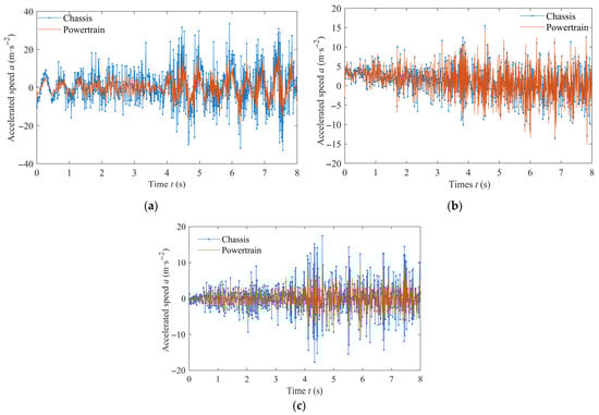 Three directional acceleration responses of chassis and powertrain system. (a) X-direction; (b) Y-direction; and (c) Z-direction.