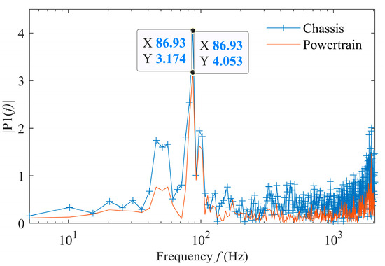 The PSD of the Y-axis acceleration response of the chassis and powertrain is solved through the Fourier transform, and its frequency domain response characteristics are shown in Figure 9. When the road spectrum level is E and the vehicle speed is 10 m/s, the peak vibration in the chassis and powertrain appears at 86.93 Hz. The second- and third-order vibrations of the powertrain have a significant impact on both the chassis and the powertrain. Due to the complex system composition, there are multiple peaks in its response.