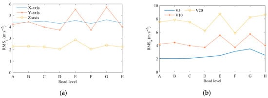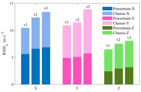 Root mean square of acceleration response for powertrain (a) in three directions and (b) different vehicle speeds.