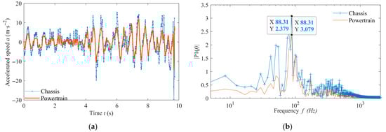 Simulation of Y-axis acceleration response of chassis and powertrain system. (a) time-domain; (b) frequency-domain.