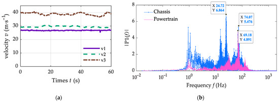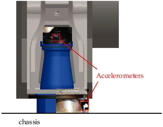 In order to further verify the correctness of the dynamic analysis results of tracked vehicles during travel, sports car tests with different vehicle speeds were conducted on a certain level of road surface. The acceleration sensors were installed at the upper and lower ends of the two shock absorbers, as shown in Figure 12. Using the on-board GPS to record the vehicle speed in real time, the RMS of the three-way acceleration of the chassis and powertrain for the vehicle at different speeds was obtained, as shown in Figure 13. It can be seen that the vibrations in the X and Y directions of the chassis and the powertrain are more severe. The vibration in the X direction of the powertrain is greater than that of the chassis, while the other two directions produce less severe vibrations than that of the chassis. Moreover, the vibration RMS of the chassis and powertrain both increase with the increase in the vehicle speed. At vehicle speed v3, the powertrain shows a 29.98% RMS acceleration reduction in the Y-direction and 35.17% in the Z-direction compared to the chassis, while exhibiting a 4.75% increase in the X-direction. Figure 14 shows the PSD curve of the vibration power of the powertrain and the Y-direction acceleration of the chassis at the speed v3. It can be seen that the chassis and the powertrain vibrate violently at 74.07 Hz and 69.18 Hz, respectively, which is consistent with the simulation results.