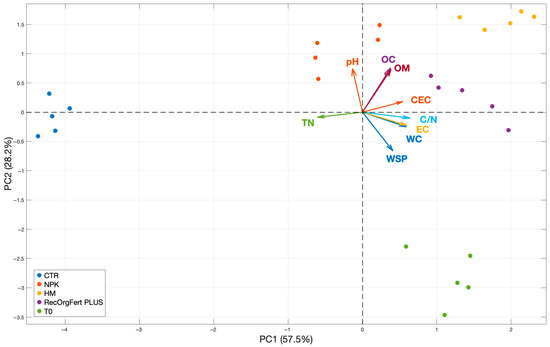 Principal Component Analysis (PCA) of the soil’s physical and chemical properties under different fertilization treatments. CTR (control) = soil without fertilizer; NPK = nitrogen–phosphorus–potassium; HM = horse manure; RecOrgFert PLUS = S bentonite + orange residue. WC = water content; pH= potential of hydrogen; EC = electrical conductivity; OC = organic carbon; TN = total nitrogen; C/N = carbon-nitrogen ratio; OM = organic matter; WSP = water-soluble phenols; CEC = cation exchange capacity.