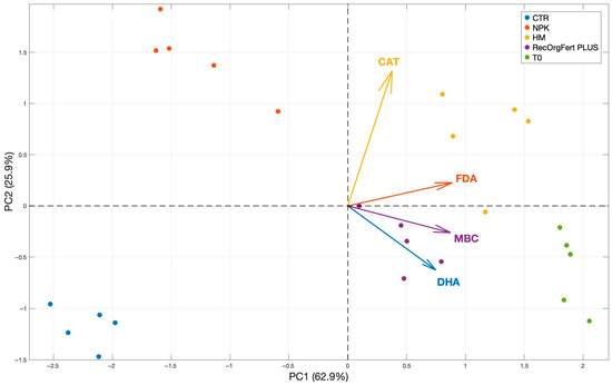 Principal component analysis (PCA) analysis of the soil’s biochemical properties under different treatments: CTR (control) = soil without fertilizer; NPK = nitrogen–phosphorus–potassium; HM = horse manure; RecOrgFert PLUS = S bentonite + orange residue. DHA = dehydrogenase; FDA = fluorescein diacetate hydrolase; CAT = catalase; MBC = microbial biomass carbon.