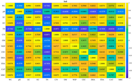 Pearson correlation matrix illustrating the relationships between biochemical, chemical and physical soil parameters. The correlation coefficients range from −1 (strong negative correlation, in dark blue) to +1 (strong positive correlation, in yellow), with the color scale visible on the right. WC = water content; pH= potential of hydrogen; EC = electrical conductivity; OC = organic carbon; TN = total nitrogen; C/N = carbon–nitrogen ratio; OM = organic matter; WSP = water-soluble phenols; CEC = cation exchange capacity; DHA = dehydrogenase; FDA = fluorescein diacetate hydrolase; CAT = catalase; MBC = microbial biomass carbon. In the correlation analysis graph, the yellow color indicates statistical significance level at p < 0.001; the green color indicates statistical significance at p < 0.01; and the blue color and its tonality indicates statistical significance at p < 0.05.