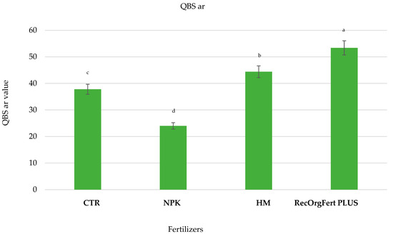 Soil biodiversity, assessed through QBS-ar values (Figure 4), was significantly influenced by the type of fertilizer. Soils treated with RecOrgFert PLUS showed the highest QBS-ar scores, indicating a biologically more active and structured soil community compared to NPK and HM. The soil treated with NPK showed the lowest biodiversity index, inducing the least favorable environment for soil fauna among the fertilizers tested.