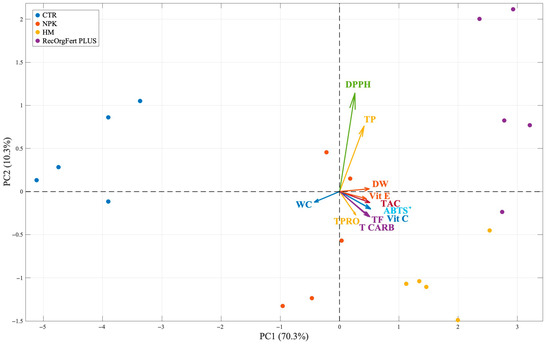 Principal Component Analysis (PCA) of the nutraceutical properties of broccoli cultivated in soils under different fertilization treatments. Treatments include CTR (control) = soil without fertilizer; NPK = nitrogen–phosphorus–potassium; HM = horse manure; RecOrgFert PLUS = S bentonite + orange residue. WC = water content; DW = dry weight; TP = total phenols; TF = total flavonoids; DPPH = 2,2-difenil-1-picrilidrazile; ABTS+ = 2,2′-azino-bis-3-etilbenzotiazolin-6-solfonato; TAC = total antioxidant capacity; Vit C = vitamin C; Vit E = vitamin E; TPRO = total protein; TCARB = total carbohydrates.