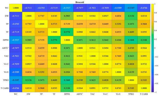 Pearson correlation matrix of broccoli quality parameters. The color gradient indicates the strength and direction of the correlations, with positive correlations shown in blue and negative correlations in red. Strong correlations highlight potential interdependencies among quality traits influenced by different soil fertilization treatments. WC = water content; DW = dry weight; TP = total phenols; TF = total flavonoids; DPPH = 2,2-difenil-1-picrilidrazile; ABTS+ = 2,2′-azino-bis-3-etilbenzotiazolin-6-solfonato; TAC = total antioxidant capacity; Vit C = vitamin C; Vit E = vitamin E; TPRO = total protein; TCARB = total carbohydrates. In the correlation analysis graph, the yellow color indicates statistical significance level at p < 0.001; the green color indicates statistical significance at p < 0.01; and the blue color and its tonality indicates statistical significance at p < 0.05.