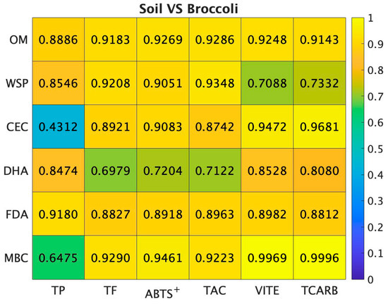 Pearson correlations between soil properties and broccoli quality under RecOrgFert PLUS treatment were very high across nearly all combinations, indicating a strong association between soil quality and nutritional and nutraceutical quality. Specifically, MBC was highly correlated with TP (0.9998), TAC (0.9992), vitamin E (0.9828), and TCARB (0.9972). FDA showed strong correlations with vitamin E (0.9981), TAC (0.9965), and TCARB (0.9803). DHA exhibited extremely high correlations with TF (0.9996) and ABTS+ (0.9966), in contrast to the negative correlations observed under NPK. WSP and CEC also showed high values, with WSP–vitamin E at 0.9993 and CEC– ABTS+ at 0. These findings suggest that RecOrgFert PLUS created a pronounced synergistic effect between soil quality and the nutritional and nutraceutical profile of broccoli, outperforming other treatments.