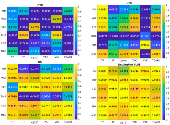 Pearson correlations matrix between soil quality and broccoli quality treated with different fertilizers: CTR (control) = soil without fertilizer; NPK = nitrogen–phosphorus–potassium; HM = horse manure; RecOrgFert PLUS = S bentonite + orange residue. The color gradient indicates the strength and direction of the correlations, with positive correlations shown in blue and negative correlations in red. OM = organic matter; WSP = water-soluble phenols; CEC = cation exchange capacity; DHA = dehydrogenase; FDA = fluorescein diacetate hydrolase; MBC = microbial biomass carbon; TP = total phenols; TF = total flavonoids; ABTS+ = 2,2′-azino-bis-3-etilbenzotiazolin-6-solfonato; TAC = total antioxidant capacity; Vit E = vitamin E; TCARB = total carbohydrates. In the correlation analysis graph, the yellow color indicates statistical significance level at p < 0.001; the green color indicates statistical significance at p < 0.01; and the blue color and its tonality indicates statistical significance at p < 0.05.