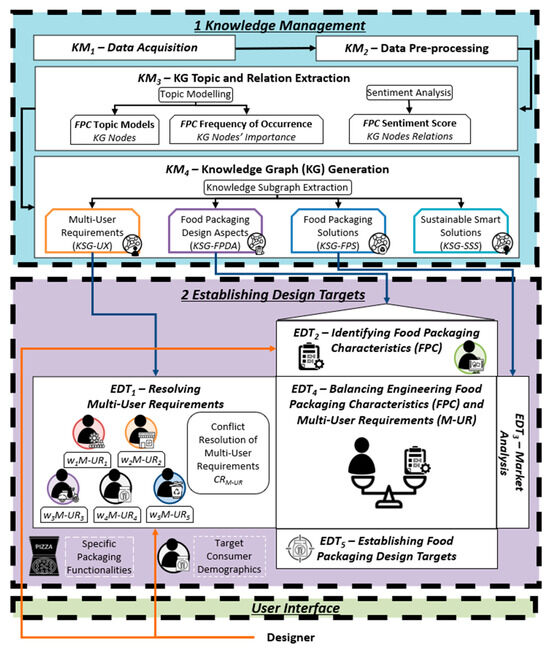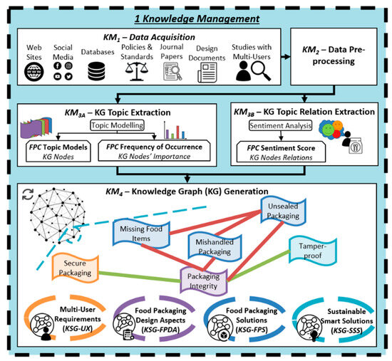 At its core, the first module of the framework (Frame 1: Knowledge Management) captures data on users and product attributes from online sources (KM1), and this data is pre-processed for analysis (KM2). Topic modelling and sentiment analysis techniques identify topic models, their associated user sentiment, and frequency of occurrence within a corpus (KM3). This knowledge is represented in a knowledge graph (KM4).