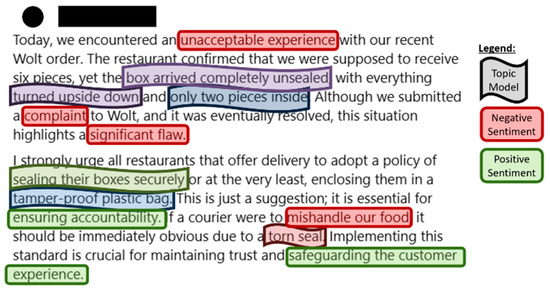 Once the data has been pre-processed, topics and keywords can be identified to obtain meaningful information from the data in relation to product design. One notable topic modelling technique is Latent Dirichlet Allocation (LDA), which is a flexible generative probabilistic model used to uncover latent topics and the frequency at which they appear in a corpus [36], and it can be easily embedded into complex models. Then, sentiment analysis techniques are applied on the keywords to extract the attitude expressed in topic models by assigning a positive, negative, or neutral emotional expression. The polarity of keywords is extracted, and predictions can be made by a text classifier model. It was shown that Support Vector Machine (SVM) is an effective classifier for transforming low-to-high-dimensional space with minimal overfitting [36]. To illustrate this, consider the review depicted in Figure 5 [37]. In this example, a consumer is complaining about unsealed and mishandled packaging during delivery, which resulted in missing food items. The consumer also made note that a “tamper-proof plastic bag” will ensure that the delivery courier is held accountable whilst “safeguarding the customer experience”. Through topic modelling techniques, the framework identifies the topic models from the review, which represent the knowledge graph (KG) nodes. The sentiment aspect extracted by means of sentiment analysis models provides the KG node relations.
