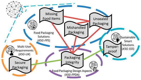 - Identifying Engineering Characteristics (EDT2): This stage represents how the user needs can be satisfied by the product. The engineering characteristics are extracted, also by means of probabilistic language analysis methods applied on the Food Packaging Design Aspects sub-graph (KSG-FPDA). From the knowledge graph in Figure 6, one such instance would be “packaging integrity”. The designer can also input specific packaging functionalities in this step, for example, to choose what type of take-away packaging they need to develop.