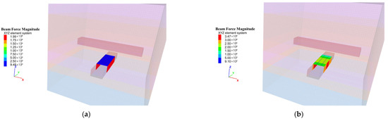 As illustrated in Figure 11, under no vehicle load conditions, the total displacement of the I-beam support at both sidewalls of the 5−1 coal roadway is approximately 0.225 mm, while that of the roof is about 0.3 mm, indicating minimal overall deformation of the support structure. As the vehicle approaches the center of the roadway, the deformation of the roof increases more significantly than that of the sidewalls, suggesting that the dynamic load is transmitted more prominently through the roof and floor. When the rubber-tired vehicle is 10.0 m away from the center of the 5−1 roadway, the total displacement of the sidewalls is about 0.25 mm, and that of the roof is approximately 0.3 mm, indicating negligible variation in the deformation of the I-beam support. At a distance of 4.0 m from the center, the deformation range increases significantly, with the sidewall displacement reaching about 0.4 mm and the roof displacement reaching about 0.5 mm. Moreover, the deformation on the side closer to the vehicle is relatively larger, reaching up to 0.55 mm. When the vehicle is 1.5 m from the center of the 5−1 roadway, the total displacement of the sidewalls remains around 0.4 mm, and that of the roof increases to approximately 0.55 mm, showing a generally symmetrical deformation pattern in the I-beam support structure.
