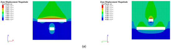 As illustrated in Figure 10, when no vehicle is present, the total horizontal displacement at both sidewalls of the 5−1 roadway is approximately 0.50 mm, and the combined displacement at the roof and floor is about 2.00 mm, indicating minor deformation of the surrounding rock. As the vehicle approaches the center of the roadway, the horizontal displacement of the sidewalls increases to 1.00 mm, while the combined displacement of the roof and floor rises to 2.50 mm, demonstrating a significant expansion in the deformation zone. The greater deformation observed in the roof and floor compared to the sidewalls suggests that the dynamic load of the vehicle is more effectively transmitted through the vertical direction. The deformation distribution is symmetric along the sidewalls but exhibits localized concentration in the roof and floor, depending on the position of the vehicle load. The closer the vehicle is to the roadway center, the larger the deformation, with more pronounced tensile strain occurring at the roof. After the vehicle passes the center of the roadway, the deformation intensity in both the roof/floor and sidewalls gradually decreases; however, the expansion of the plastic deformation zone remains evident.