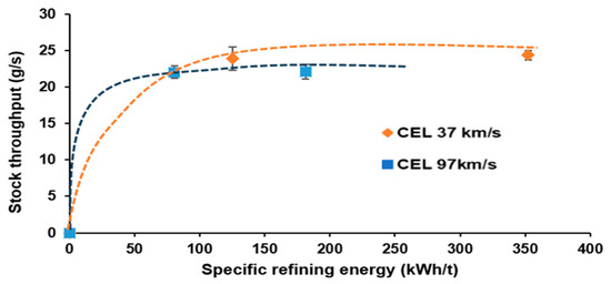 Figure 1 compares the stock throughput (g/s) as a function of specific refining energy (kWh/t) for KOCCs refined with plates of two different cutting edge lengths (CELs), 37 km/s and 97 km/s. The conventional plate at 37 km/s presents higher initial throughput, reaching up to approximately 25 g/s at about 70 kWh/t, evidencing greater throughput efficiency at lower energy consumption. This increased throughput is largely due to wider grooves that lower resistance to stock flow, facilitating material passage and reducing energy expenditure. Throughput stabilizes near 24 g/s at higher specific energies (~125 kWh/t), indicating consistent performance.