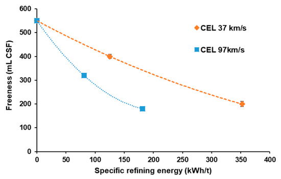 A comparison of the bulk properties of paper made from KOCCs refined with 37 km/s and 97 km/s CEL plates is provided in Figure 5. Paper bulk, which reflects the volume occupied by a given mass of paper, is a key property influencing texture, porosity, and end-use performance [29,32].