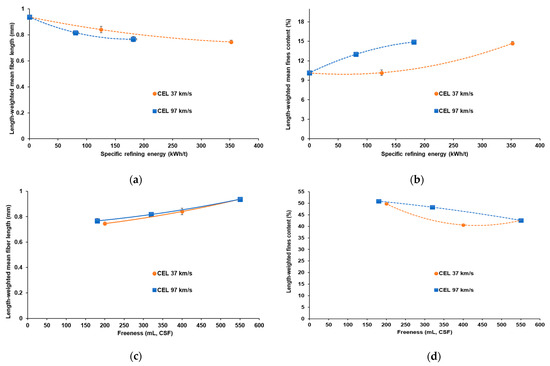 Effect of refining energy on mean fiber length and fines contents for KOCCs with different CELs. (a) Refining energy versus fiber length. (b) Refining energy versus fines contents. (c) Freeness versus fiber length. (d) Freeness versus fines contents.