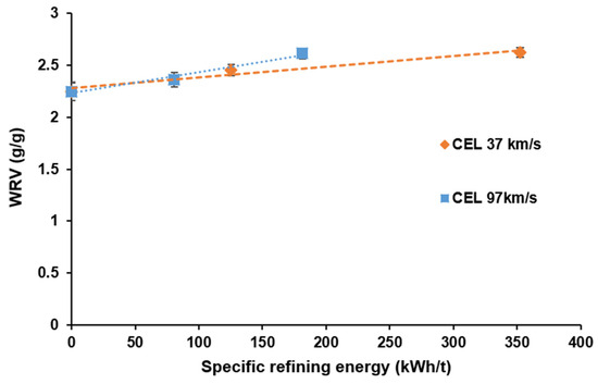 The observed increase in WRV with higher specific refining energy for both refiner plates underscores the importance of refining energy in enhancing KOCC fiber water retention. However, the ultra-fine bar plate at CEL 97 km/s demonstrates a more pronounced improvement in WRV, attributable to its superior capacity for inducing fibrillation [5,7]. This makes the ultra-fine bar plate particularly suitable for ultra-low intensity refining of recycled fibers like KOCCs.