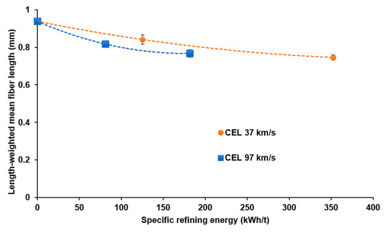 Figure 4 illustrates how the water retention value (WRV) of Korean Old Corrugated Containers (KOCCs) fibers evolves when refined with two different refiner plates, featuring cutting edge lengths (CELs) of 37 km/s and 97 km/s. The results show that as specific refining energy increases, WRV also slightly increases for both refiner plates. This trend supports the well-established understanding that higher refining energy enhances the water retention capacity of fibers, which is beneficial for improving fiber bonding and the mechanical strength of paper [28,29].