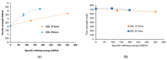 Comparison of strength properties versus specific refining energy for KOCCs at CELs of 37 km/s and 97 km/s; (a) Tensile strength; (b) Tear strength.